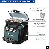 TITAN BY ARCTIC ZONE ZIPPERLESS COOLER: Cooler features a patented, "flip-open" Zipperless lid for quick access to food and drinks; Keeps ice for up to two days and holds up to 16 cans DEEP FREEZE PERFORMANCE INSULATION: Features Deep Freeze Performance Insulation with an integrated radiant heat barrier; Perfect for keeping food and beverages cold during travel, tailgates, picnics, and more HARDBODY LINER WITH SMARTSHELF: Includes a removable HardBody liner with SmartShelf that allows you to separate hard items from soft so sandwiches and other soft foods don't get crushed; SmartShelf easily removes for extra space ULTRA SAFE LEAK PROOF, INTERIOR LINING: Interior lining is leak proof and has Microban protection DESIGNED FOR CONVENIENCE AND USABILITY: Cooler features an adjustable Backsaver shoulder strap with an anti-slip shoulder pad for carrying comfort; Rugged exterior material is water and stain repellent and easy to wipe clean