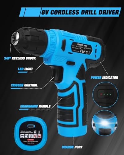 - 8V Power Cordless Drill with LED: Featuring a compact, ergonomic design, this drill boasts a non-slip grip for secure handling. Its lightweight build enhances maneuverability, while adjustable speed settings (up to 800 RPM no-load speed) adapt to varied applications. The integrated LED light ensures visibility in low-light conditions