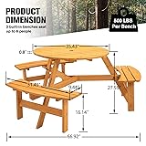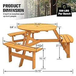 Spacious Dining Area: The 43.3" large round tabletop offers ample space for family gatherings or friends' outings, accommodating all your dining essentials with ease. Comfortable Seating for Eight: Featuring 4 curved benches seamlessly integrated into the design, this picnic table ensures everyone can sit comfortably, making it perfect for large groups. Durable Fir Wood Construction: Crafted from 100% fir wood, this picnic table boasts exceptional sturdiness and resistance to cracking, promising long-lasting use even in outdoor conditions. Robust Support Frame: A thickened support frame underpins the table, guaranteeing a substantial weight capacity that can handle up to 2220lbs, ensuring stability and safety during meals. Versatile & Safe Design: With a built-in 2" diameter umbrella hole compatible with most parasols, you can enjoy shaded dining. Plus, the smooth round edges are thoughtfully designed to prevent accidental bumping, while the option for free painting lets you customize your picnic table to suit your style.