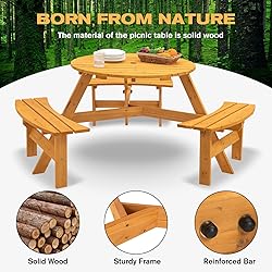 - Product Name:6-Person Circular Outdoor Wooden Picnic Table for Patio, Backyard, Garden, DIY w/ 3 Built-in Benches, 1720lb Capacity - NaturalPlace of Origin:ChinaMain Color:Natural