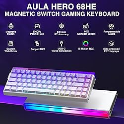 Hall Effect Magnetic Switch & Ultra-fast Response: Equipped with hall effect magnetic switches, the AULA HERO 68HE gaming keyboard has an ultra-fast 8K polling rate and ultra-low latency of 0.125ms to keep you ahead of the competition. Featuring premium construction and advanced magnetic switch technology, this hall effect keyboard ensures flexibility and superb response, perfect for FPS and other rhythm games Fast Trigger Mode & Ultimate Precision: This mechanical gaming keyboard features fast trigger mode and industry-leading precision. With an adjustable RT range of 0.1-3.4mm and an accuracy of 0.01mm, every keystroke can be recorded instantly and reliably. This advanced feature makes it the perfect choice for gamers and professionals seeking the ultimate in control and efficiency Programmable Web Driver: No need to install, the HERO 68HE driver allows users to remap key functions, set macros and hotkeys, adjust lighting modes and DIY lighting effects, and adjust the actuation point according to your typing habits or gaming needs for true customization and personalization. (This driver does not support MAC, only compatible with windows system).Web driver connection: bit.ly/m/AULA Personalized Lightbox Design & RGB Backlit: The rgb lightbox design on the front side is so cool and gives you an immersive gaming experience. The light up keyboard features 16.8 million colors of rgb lighting effects with south-facing LEDs for a better visual experience. 20 lighting effects add a great ambience to games. Lighting effects and brightness can be easily adjusted via driver or FN and key combinations. The backlight can be turned off if not needed 60% Wired Gaming Keyboard: No matter the outlook, the construction, or the function, this fast trigger keyboard is definitely a professional gaming keyboard. This 68-key 60% layout compact keyboard can save more desktop space while retaining the necessary arrow keys for gaming. USB-C wired mode provides gamers with a more stable connection and greatly enhances the gaming experience. Side-Printed PBT Keycaps: Side-printed keycap keyboard are currently a new trend worldwide. These side-engraved PBT keycaps take double injection molding and heat sublimation process, which are more durable without fading, sweat-proof, and softer to the touch, allow the keyboard's light to shine through fonts. Compared with traditional keyboard, this pc gaming keyboard can bring you a very different keyboard using experience.