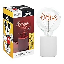 - Spread some Disney magic into your space and enhance your daily lighting by using this Mickey Mouse LED Neon Light Bulb. The lamp is 24.5cm high and comes with a ceramic base. Its decorative E27 LED bulb writes "love", featuring Mickey's iconic ears, and illuminates with a warm red glow. Housed in a clear glass bulb, it is perfect for adding character to any room by simply pressing a switch. Simply plug in the supplied power cable to turn it on! The Mickey Mouse LED Neon Light is perfect for adding a unique touch of Disney magic to a bedroom or living space.
