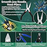 [What you Get] The 31pcs crafting hobby tools set contains 1pc 5 inch flush cutters with plastic protective cover, 2pcs precision tweezers, 4pcs sandpapers (#600, #800, #1000, #1200), 1pc model separator, 1pc 3 in 1 sanding stick, 1pc 100/180 grit black sanding stick, 1pc a4 cutting mat, 1pc steel ruler, 1pc model parts opener, 1pc 4-ways buffer block, 1pc smooth-jaw needle nose pliers, 3pcs model glass polishing files, 1pc cleaning brush, 1pc pin vise hand drill with 10pcs, 0.8-3.0mm micro twist drill bits. [Multinational Modeler Making Tools] The glass files are the equivalent of sandpaper from 10,000 grit to 12,000 grit, which provides a fine finish on the surface of your model; The smooth-jaw Needle nose pliers can be used for post-assembly of models, avoiding indentation, protects painted or plated surfaces; The micro flush cutters with angled head design can be used for cleanly removing exposed gates without leaving white marks; The plastic model separator can disassemble the assembled parts and can be used as a sander. [Practical model tools for Modeler] The aluminum alloy hand drill with 10 sizes of steel drill bits to drill nice neat holes. the cutting mat won't hurt the cutter blade and keep the blade sharpness, protect your working table surface. The steel ruler can prevent sizing errors;The precision tweezers can be used to hold stickers and fix small parts; The polishing blocks gentle to polish your delicate model parts without damage. [Durable Material] The side cutters are made of 65# manganese steel and heat treated for strength and durability, black oxide finishing improves the corrosion resistance. The needle pliers are forged from industrial-grade 45 steel for high hardness and strength, and has spring-loaded design makes it easy to open and close. The glass files are made of high-quality tempered glass, featuring high hardness and excellent wear resistance. The 3mm-thick art cutting mat is made of self-healing PVC materials, offering enhanced durability and cut-resistance. [Wide Application] Our model kit tools are perfect for Gunpla, for Gundam figures, PG modeling, car replicas, build model airplanes, 3D printing production, art production, do any of the DIY miniature buildings, car replicas, or other intricate models. Suitable for model beginner and advanced modeler, a great gift your friends and family who like animation, cartoons, models.