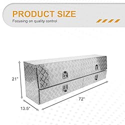 - Aluminum Stripes Plated Truck Tool Box(silver) Product Description: 100% brand new, Never been tried or installed Material: Mental Product Dimensions:72 x 21 x 13.5 Inch Stripe tread pattern reinforces the aluminum material for maximum strength and longevity. Rust and corrosion resistant construction offer years of dependability. Secure and Protective: A stainless steel latch keeps your tools and supplies secure, protecting against theft and weather elements. A weather rubber seal prevents moisture or water from seeping through, ensuring your tools stay dry. Warm tips: If you encounter any problems during product installation, please feel free to communicate with us and we are happy to provide you with answers.