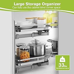 Please measure the cabinet dimensions before purchasing, and choose the appropriate size according to your needs to avoid unnecessary returns. A significant difference between the cabinet and turntable dimensions will result in low space utilization. Two Layer Large Shelf: Pull Out Cabinet Organizer each tray swings independently providing a convenient user experience,270° rorating. You can fully use the cabinet blind corner space and easily take the stuff inside the cabinet. The corner is no longer a dead end! Large Storage Organizer: This kitchen blind corner cabinet organizer has a large load capacity, each basket is exceptionally durable and can hold up to 33 lbs. It can be completely pulled out and pulled in, which is convenient for people who are inconvenient to bend over, including the elderly, children, pregnant women, and obese people. Damping Effect make Smooth Turning and Swinging: Corner Cabinet Organizer With a hydraulic soft-closing device, Roll smoothly and No Noise. Independent swing out tray. Unique design prevent objects from tilting. When your finished just push it back and it self closes. Very pratical to use! Adjustable the Tray Height: Height adjustment: 22.8 to 29.5 inches. Our Pull out Blind Corner Cabinets maximize underutilized space in corner kitchen cabinets. We can adjust the height of each level according to the kitchen utensils stored, and the two shelves can hold more items, making our kitchen look more tidy and orderly. Easy to install:Package contains all the components required for installation, your blind cabinet shelf can be easily mounted to the cabinet follow the step by step instructions. Please make sure your cabinet can accommodate it before order. The minimum installation cabinet size is 29.5"W x 18"D x 23"H. Note: Not suitable for cabinets made of granite or slate internal materials!