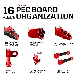 16-PIECE: This kit includes everything you need to organzie your tools in your garage or shop. The 10- slot wrench holder, 10 universal hooks, 9-slot screwdriver holder, can holder, accessory holder, and 2 quick straps will convienentely hold all of your tools on peg-boards for quick access when working. QUICK RELEASE: Easily detach holders from your peg board with the innovative quick release pegs VERSATILE: Attach to peg board and keep your tools close by as you work PEG BOARD MOUNTABLE: This allows for quick and easy installation