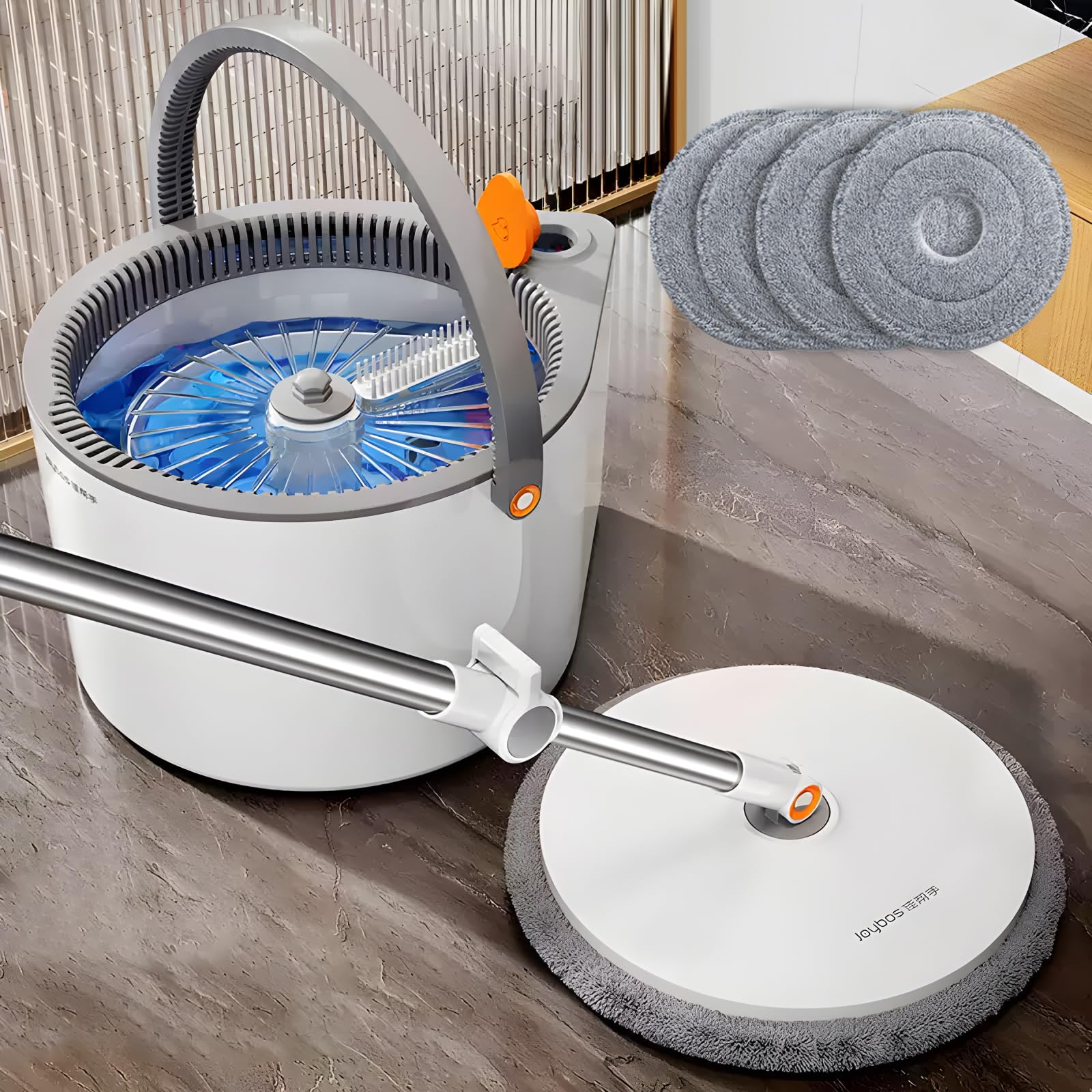 [Wash&Dry] mop and bucket with wringer set, 2-bucket mop system, wash and dry, scratch dirt away in wash chamber, squeeze out of water in dry chamber, hands-free cleaning mop with bucket. [Rubber Scraper] Mop head Shovel design to tackle dried spills, food residue, mud, and sticky stains without damaging floors. Effortlessly scrape off gum, grease, or soap scum in garages, outdoor patios, or high-spill zones like restaurants and workshops. [Clean Quickly] by pull up and down in one side of water container with water and remove excess water on the other side with no water by pull up and down a few time. The mop pads pick up dirt well and don't leave the floors too wet, they dried relatively fast. There are suction cups on the bottom of the bucket to keep it from tipping over. [360° Spin ] Rotation flat mop-head can reach to any corners and those "under-the-whatever" places, much suitable to be a wet dry mop for walls, wall cleaner . [Reusable Cleaning Microfiber Cloths] Applied to a 13" * 4.7" mop head. 2 microfiber mop pad refills come with this set. Strong water absorption lets you easily do any wet and dry cleaning.