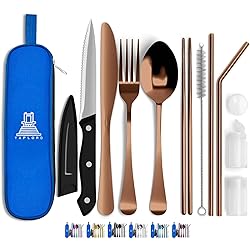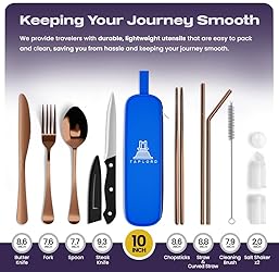 ✅ Providing a fancy dine-in experience anywhere around the globe: This travel utensils Set with Case has 10 portable utensils including a spoon, fork, knife, butter knife, chopsticks, 2 straws, 2 salt shakers, and a straw cleaner, Camping utensils set is Portable, lightweight, and durable travel cutlery for outdoor adventures. ✅ Super Handy to Carry: The 9.8x2.6" case makes it a portable travel utensil set. Lightweight and water-resistant, this reusable silverware set with case is perfect for camping, trips, picnics, hiking, eskys, caravans, scouts, and more. The travel cutlery case stabilizes the utensils, preventing noise on the road. ✅ Say No To Single Use Plastic: Our reusable utensils set with case helps protect the planet from global warming. Use this durable silverware case travel set for an extended period, reducing single-use plastic waste. ✅ Easy To Clean: Taplord's silverware camping set with case is waterproof, dishwasher safe, and stainless steel. Hygienic and perfect for daily use, this portable utensils set with case simplifies cleaning. ✅ Detail Oriented: Travel cutlery set with a simple appearance, smooth edges, stainless steel, lightweight yet stylish. Any style of kitchen can be equipped with these travel utensils and cases to meet the basic dining requirements of every consumer. Traveling with it is hassle-free, portable, versatile, and easy to clean