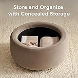 - Introducing Mopio’s Luna Storage Ottoman—a modern, innovative piece that redefines multifunctional living. With a trendy round silhouette, this round ottoman makes a bold statement in every room. More than just an ottoman with storage, Luna serves as a versatile solution for contemporary spaces, as a round coffee table for entertaining guests, an ottoman foot rest for ultimate relaxation, or an extra seat when hosting. Crafted for modern living, Luna effortlessly converts into a stylish accent piece. The hidden storage compartment tucks away clutter, while ventilation holes keep the interior fresh and odor-free. Whether you're hosting a lively gathering or enjoying a quiet evening at home, this piece adapts to your lifestyle with ease. Built with high-quality foam and a sturdy frame that supports up to 286.6 lbs, Luna promises exceptional durability and lasting comfort. Its cushion top delivers a plush seating experience, and the reversible tray top provides a convenient surface for drinks and snacks, allowing seamless transitions between leisure and entertainment. Available in multiple fabric options, including our easy-to-clean pearl white performance bouclé fabric and soft velvet fabrics, Luna enhances any home aesthetic, making it not only a practical addition but also a design-forward statement piece. Embrace the fusion of functionality, style, and convenience with Mopio’s Luna Storage Ottoman. Sit. Store. Serve in style with Luna.