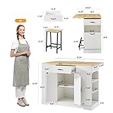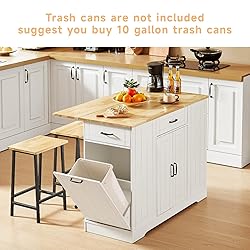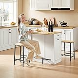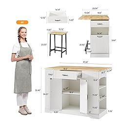 【Kitchen Islands with Large Storage Space】This kitchen island features large storage cabinets and two large drawers.There is a 3-level storage shelf on the side of the cabinet. Wide countertop and adjustable shelf supply ample space for your storage need, ideal for store tableware, kitchenware, spices, towels, utensils and kitchen electrical appliance etc. 【Stationary Kitchen Islands include 2 Chairs】This Stationary island countertop is ingeniously designed. It is equipped with two metal bar stools in an industrial style. The chairs are sturdy and reliable, providing users with an ideal seating solution. The entire set is designed in an integrated manner, eliminating the trouble of matching and helping to create a professional-level home cooking workstation. 【Metal Support Foot Frame】The Kitchen island counter is equipped with adjustable footrests and innovatively features ground-adaptive adjustment knobs, which can adapt to various ground materials such as tiles, wooden floors, and self-leveling floors. Additionally, the bar stools are designed with support rods that effectively distribute 30% to 40% of the weight pressure on the thighs, significantly enhancing convenience and comfort during meals. 【Good Quality Worktop】Imagine having a kitchen island worktop that is not only thick and stable but also built to last. Our worktop is made of wood, ensuring durability and resistance against bending, splitting, and cracking. The surface treatment adds an extra layer of protection, making it incredibly easy to clean and maintain. With this kitchen island worktop, you can confidently tackle your kitchen tasks without worrying about wear and tear. 【Foldable Drop Leaf Countertop】As you prepare your cooking ingredients on the kitchen island, the drop leaf countertop provides you with additional workspace. Supported by 2 metal brackets, it offers stability and reliability. Simply unfold the drop leaf countertop, and it expands to a width of 28.54 inches, providing enough space to accommodate your cooking ingredients. When you're done using it, you can easily fold the countertop back, adding convenience and comfort to your cooking experience. 【Multipurpose Use Kitchen Island With Power Outlet】Kitchen island table equipped with practical 1500W power outlets, including 2 USB ports and 2 3-hole sockets, easily charge your phone, tablet, or e-reader while using appliances like coffee makers, toasters, or microwaves.It suitable for use as a square kitchen food & coffee bar, kitchen bread rack, microwave oven & bakers cart, prep counter workstation etc. Ideal for kitchen, dining room, restaurant, etc. 【Easy to Assemble】Product size: 47.24" L x 28.54" W x 35.43" H. Each part has a letter or number mark,With instructions and all the necessary tool included, there is also an installation video for reference,you'll take 1 hour to assembling this kitchen island.If you have any difficulty assembling the kitchen island, please feel free to contact us.