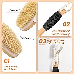 Detachable Design: The detachable design allows each brush head to have a rope attachment.The long handle is equipped with an anti-slip silicone sleeve, making it easy to use either individually or in combination. High Quality Material: This body brush set has high-quality pig hair bristles that don't fall out easily. The handle is hand-polished for a smooth finish and has an ergonomic design for a secure grip. Wet & Dry Use:When used as a dry brush, it can unclog pores and accelerate blood circulation. Not only relieve stress but also make the body more energetic. When used in the shower, it can achieve a deeper exfoliation effect. Great for dry rough skin and other skin concerns. Wash the brush once a week to keep it clean. Ergonomic Beechwood Handle: Our 20.6-inch dry body brush with handle provides an ergonomic grip, facilitating an effective lymphatic massage. This premium dry brushing body brush set is perfect for hard-to-reach areas like the back. Easy to Clean & Store: This back scrubber is treated to resist water damage and features a hanging loop for convenient storage. After use, just rinse it with soap and water and hang to dry.