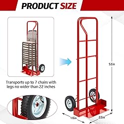 Heavy Duty and Durable: our chair dolly for stackable chairs is made of reliable iron with red coating, which can resist rust and dust, strong and durable, and can support up to 7 chairs with a table leg width of 22 inches, providing you with a more convenient way of transportation U Shape Handle Bar Design: the red stackable chair dolly features U shaped tubular handle bar on the back and with smooth surface, which is easier for you to hold, and providing you a better experience when transporting stackable chairs Quiet and Smooth Rolling: this metal stackable chair dolly measures about 52 x 22 x 18 Inches in overall size, narrow design fits through standard doorways; And it is equipped with 8 inches oversized rubber wheels, ensures quiet and smoothly rolling, good for transporting stackable chairs to various events or occasions Easy Installation: the chair cart for stackable chairs comes with complete accessories, such as sturdy iron pipes, fixing screws and nuts, etc., and attached with installation instructions, that is easy to install for female, male, elderly and more Wide Application: our stack chair dolly with rubber wheels is ideal for transporting multiple stackable chairs at one time, that can be applied in various gathering places, such as banquet halls, churches, auditoriums, hotels and more, helping you to transport easily and conveniently