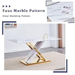 - The white dining table tabletop is made of artificial marble material,and the dining table frame is made of X-shaped metal frame with golden electroplating technology. It is fashionable and modern,suitable for many home decoration styles.The chair has high comfort and is sturdy and durable,