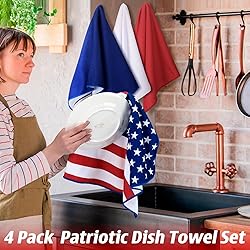 Celebrate Patriotism Every Day: transform your kitchen into a festive hub with our 4th of July kitchen towels; Each set includes four patriotic hand towels, adorned with red, white, blue, and American flag patterns; These decorative towels bring a modern elegance to your kitchen, making every cleanup a nod to national pride Unique Design: featuring a fabric tag in each corner, these American flag kitchen towels are effortless to hang; They are suitable for easy access during patriotic festivities; Not only do they freshen up your kitchen, but they also add a stylish flair to your Independence Day celebrations Convenient Size and Design: sized at 24 x 16 inches/ 60 x 40 cm, our patriotic kitchen towels are designed to fit perfectly into any kitchen space; Their dimensions offer ample coverage for various kitchen tasks, making them a versatile addition to your culinary toolkit while resonating with American pride Quality Fabric: made from quality polyester and cotton, these patriotic kitchen towels excel in both drying and cleaning tasks; Their absorbent and quick-drying nature keeps your dishes spotless and ensures durability; Trust these towels to be the reliable choice for all your kitchen needs Gift for Every Occasion: surprise your loved ones with our patriotic hand towels, a gift that's both thoughtful and enduring; Ideal as birthday, Mother's Day, or housewarming presents, these towels infuse kitchens with festive joy; They seamlessly blend into any kitchen setting, enhancing baking, cooking, and entertaining experiences