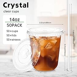 - Features: Comprehensive set, different design, you will be surprised, thick U shaped cup with anti spill lid and moderate length straw, enhance your drinking experience, suitable for coffee and various hot and cold drinks Kind tips: check the diameter of the straw and do not use overly viscous drinks to avoid affecting the drinking experience Specifications: Material: PET Color: transparent Plastic cups capacity: about 14 oz Straw size: about 0.24 x 7.48 inches/ 6 x 190 mm Package includes: 50 x Cups 50 x Cup lids 50 x Straws Notes: Manual measurement, please allow slight errors on size. The color may exist a slight difference due to different screen displays.