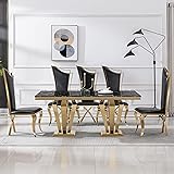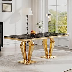 - Features:High Glossy Marble Top: The top of the dining table made of MDF(18MM thickness) with high gloss finish. The table top smooth,waterproof,heat resistant and scratch resistant-safe. Easy to maintain and can be used for many years without fading or damage.Unique Base: We have various shape stainless steel base with silver/gold mirrored finish is one of the key elements to highlight in its design. A perfect table to bring the elegance and avant-garde style to your kitchen, living room, or dining room.Elegance Style : High quality stainless steel base with silver mirrored finish is the combination of classical and modern. Match with marble top to bring your home a whole new art style.Aesthetic and Practical: Versatile and functional, its rectangular marble top offers the vintage and elegance feel that you are looking for in your dream home.High Quality: All our dining tables are made with high quality materials, guaranteeing durable and functional furniture.Decoration and Comfort: The combination of marble and stainless steel makes this dining table a perfect element to bring you the art of visure. The tabletop is big enough for 6-8 people to dine at the same time.Difference Options: You can find this dining table in different color and shape, thus being able to choose the one that best suits your home.