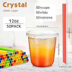 - Features: Leak Proof Lids: our disposable cups come with leak proof lids and colored straws, so you don't have to worry about spilling coffee or drinks while driving or walking. Easy to assemble and carry, whether it's a workday or a trip Transparent Materials: transparent design gives the cup the appearance of a beverage, and colored straws allow you to easily distinguish your own cup, bringing you a good drinking experience Material: PET Quantity: 12 oz Color: Cups: clear Straws: colorful Package includes: 50 x Clear cups 50 x Lids 50 x Straws Notes: Manual measurement, please allow slight errors on size. The color may exist a slight difference due to different screen displays.