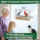【WATCH BIRDS UP CLOSE】: Transparent acrylic design offers a clear view for indoor bird watching. Watch birds feeding up close in front of the window while enjoying the beauty of nature. 【Spacious Design】Large-capacity seed tray accommodates diverse bird species Detachable feeder tray with drainage holes easy cleaning Topped with a removable bird bath for outdoor use. 【Sturdy suction cup】:Suction cup mounting Easily installed on windows without tools or drilling, this flexibility allows for seamless placement in gardens, balconies, patios and even indoor spaces, both in urban and natural environments, and securely held in outdoor climates. 【The perfect gift for nature lovers】: This crystal clear acrylic bird feeder combines functionality and artistic design, making it ideal for holiday gifts and birthday presents. Best gifts for elderly mom, gifts for dads and moms who have everything, gifts for couples who have everything, grandparents gifts, gardening gifts for women christmas gift ideas. 【NO-Worry After-Sales Services】IT IS OUR MISSION TO CREATE products that enhance people’s lives. We are a family-owned business and we strive to improve upon the products of other brands on the market, solving design and using problems to improve the customer experience. IF FOR ANY REASON YOU ARE NOT 100% HAPPY, contact us and we will make it right or return your payment!