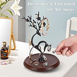 Creative Design: This jewelry tree is inspired by the cute deer. The antlers, tail, neck and wooden base all provide for jewelry storage, blending fashion with function. Stable and Durable: The earring tree organizer for women is crafted from high-quality metal, showcasing exceptional craftsmanship. Paired with a sturdy solid wood base, it provides stable support and ensures long-lasting durability. Space-Saving: The jewelry holder for women measures 5.12 x 5.12 x 7.87 inches, compact and practical, can hold a lot of jewelry and keep your countertop tidy. Perfect Gift: Our jewelry tree stand organizer boasts an elegant and sophisticated appearance, pleasing to the eye! It is the ideal gift for wives, daughters, mothers, and friends during the holiday season. Versatile Use: The necklace tree stand features an adorable design that serves as decorative accents for desks, vanities, nightstands, bathroom counters, and even store displays.