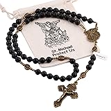 HanlinCC Black Lave Stone Beads Saint Michael Catholic Rosary Necklace with Gift Bag, the hail mary beads is 8mm Black Lave Stone Beads, the Glory Beads is 8x10mm oval Saint Michael the Archangel metal beads, rosary length is 46cm (18.1 inches), rosary unit weight is 63 grams (0.14 lbs), the rosary is handmade by stainless steel wire, it makes rosary very strong and stunning; The Lave Stone Rosary Saint Michael center piece and Pardon Crucifix are Zinc Alloy with Anti-Silver plated (Anti-Bronze Plated) , the Virgin Mary center piece and Pardon Crucifix are have good details. Each rosary pack in St.Benedict gift bag, the bag looks beautiful and strong to protect rosary well inside. Could wear daily for the rosary necklace or hang on the rear view mirror of your car, truck, or portable pocket for long driving or travel to keep calm and feel safe in hearts. The St.Michael Lava Rosary with gift box is a good gift for our Friends,Lover and Family, for First Communion, Conformation, Baptism, and Praying...