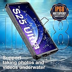 IP68 Certified Waterproof: Compatible with Samsung Galaxy S25 Ultra, clear back design. Completely fit in Samsung Galaxy S25 Ultra’s speaker, buttons, sensors, cameras and S Pen., extreme safe even after 1000 times test of using underwater 6.6ft for 1 hour. Full Body Protection: Waterproof, Shockproof, Dustproof, full sealed design exceeds military standard to adapt any outdoor activities; With a phone strap for convenient carrying. High Touch Responsive: Built-in HD plastic screen protector prevents scratch, damage and dirt, also won't affect the touch sensitivity; Fingerprint unlock function can work after attached the fingerprint film. Clear back cover will show off the beauty of your Samsung Galaxy S25 Ultra. Easy Installation: Two covers (front/back) snap on design makes it fast and easy to install or take off in seconds, suitable for daily use. Installation Guidance: Re-set your fingerprints AFTER you put the case on. Read the instructions carefully and remove the protective film that's covering the fingerprint recognition area before you do anything! Opening the charging port will made you hear and heard more clearly.