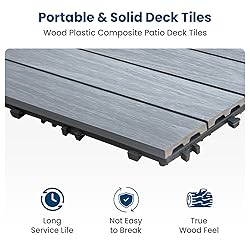 Sleek Light Grey Finish – Modern & Neutral Features a stylish light grey wood-look finish that complements contemporary outdoor and indoor décor. A clean, minimal aesthetic that upgrades any space Heavy-Duty WPC Construction Crafted from premium Wood Plastic Composite for superior strength, weather resistance, and long-term durability—no warping, rotting, or splinters. Quick DIY Interlocking Design Easy snap-lock installation with no tools or glue required. Perfect for quick home upgrades, rentals, or flexible layout designs. Waterproof & UV-Resistant Designed to withstand outdoor elements all year round—ideal for patios, balconies, gardens, pool areas, or even indoor spaces prone to moisture. Covers Up to 9 Sq. Ft. – Expandable & Customizable Set includes 9 tiles (each approx. 12" x 12"), covering 9 square feet. Modular system allows for flexible layout, expansion, or seasonal removal
