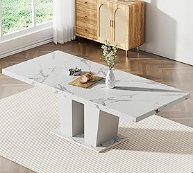 - Dining Table Features:1. Extendable Dining Table: the tabletop can be expanded from 62.99 inches to 78.7 inches through the built-in butterfly extension function and provide you with sufficient dining space2. Multifunctional Dining Room Table: The table top has a extendable function, which increases the range of use of the table. Such a large dining table can comfortably seat 10 or more.3. This elegant wood dining table is made of Particle Board and MDF, durable wood types without natural defects thanks to great workmanship in the production phase. Dining Chair Features:1. These dining chairs are made of high-quality velvet fabric, which is thick and luxurious, the touch is very delicate. This velvet dining chairs set featuring a very modern mid-century look.2. This back dining chair set is equipped with high backrest for a strong comfortable back support. Plenty decorative rivet inset around cushion and back not only make it looks noble and elegant but also give the whole chair a feeling of exquisite luxury.3. The Cushion uses a high density foam and steel spring inner with high rebound structure, providing you with a comfortable seating experience. And brings a very warm atmosphere into dining room, sitting room and apartment.4. The chair's frame and legs are made of stainless steel with enough security to hold up to 280 pounds. Specifications:Table Size: 62.99"-78.74"x35.43"x29.53"Chair Size: 24.4"x19.7"x37.5"Table Material: Particle Board + MDFChair Material: Velvet + Foam + Stainless Steel Package Include:1x Dining Table8x Dining Chairs