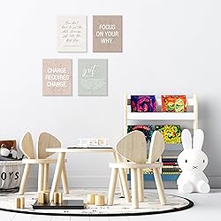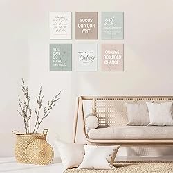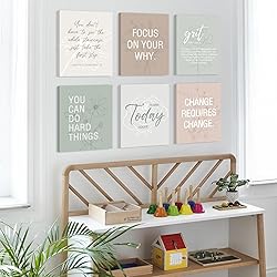 EMPOWERING QUOTES & MODERN DESIGN:Set of 6 high-quality canvas prints featuring inspirational quotes like "You can do hard things" and "Change Requires Change". Each 8x10 inch poster combines bold typography with minimalist aesthetics, perfect for home offices, living rooms, or bedrooms to boost motivation and focus. PERFECT GIFT FOR WOMEN & GOAL-GETTERS : Ideal gift for women, students, entrepreneurs, or anyone needing daily encouragement. The Grit-themed art (e.g., "Passion & Perseverance") celebrates resilience, making it a meaningful present for birthdays, graduations, or career milestones. VERSATILE WALL DECOR: Enhance any space—modern farmhouse, boho chic, or office decor. Use as a gallery wall set or standalone piece. Quotes like "Take the first step" inspire action, while "Focus on your why" adds purpose to workspaces or gyms. READY TO HANG, EASY DISPLAY:Each framed canvas (12x16 inches) arrives pre-installed with hanging hardware. Lightweight yet durable, these prints require no assembly—just unpack and hang for instant motivation. PREMIUM MATERIAL & LONGEVITY:Printed on fade-resistant, UV-protected canvas with a natural wood frame for durability. Waterproof and smudge-proof, ensuring vibrant colors for years. Non-toxic materials safe for homes with kids or pets.