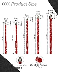 Package Include-----Total 10pcs drill bits: 3/16''(5mm), 1/4''(6mm), 5/16''(8mm), 3/8''(10mm), 1/2''(12mm); 1/4'' quick change hex shank Application-----Dry drilling materials (softer materials) are wood, plastic (PVC pipe), foam tiles, antique tiles, glazed tiles, red bricks, cement, concrete (need to avoid reinforcing steel), etc; need to add water or coolant drilling materials (harder materials) are glass tiles, porcelain tiles, ceramics, marble, glass, etc Cross-serrated Head Design-----The sharper cutting head reduces bit slipping and walking, allowing for more accurate positioning and more stable drilling. It can be used not only for direct drilling but also to assist other drill bits in achieving precise hole positioning Premium Material–Tungsten Carbide-----The drill tip is welded with industrial-grade tungsten carbide, offering excellent wear resistance and the ability to easily penetrate various materials. The drill body is made of high-strength steel, ensuring a long service life Recommended Machine-----Corded Drill, Cordless Drill, Benchtop Drill. Use electric hand drill: Recommended speed not less than 2000RPM; Faster the RPM, longer the drill bit's working life