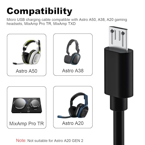 - Compatibility: Micro USB charging cable compatible with Astro A50, A38, A20 gaming headsets, MixAmp Pro TR, MixAmp TXD (NOTE: Does not fit Astro A20 GEN 2)