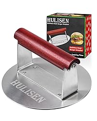 HULISEN 6.2" Stainless Steel Smashed Burger Press with Extra Wide Heat-Resistant Wood Handle, Burger Smasher for Flat Top Griddle, Grill, Skillet, Cast Iron Pan, Hamburger Cooking Accessories