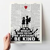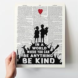 - Transform your space with this powerful Banksy-inspired motivational wall art, featuring the timeless reminder to "Be Kind" artfully displayed against a vintage dictionary page background. This striking black and white graffiti-style print adds urban sophistication to any room while conveying a message of compassion and positivity. Crafted with premium quality materials, this art print is produced on Fuji Crystal Archive Paper, ensuring exceptional detail, vibrant contrast, and rich blacks that make the inspirational message stand out. The heavyweight, fade-resistant paper offers a luxurious feel and protects against dust and fading, preserving your artwork for years to come. This versatile 11x14 inch unframed print is perfect for home offices, living rooms, bedrooms, or any space needing a thoughtful touch. The unframed design gives you the freedom to choose a frame that complements your unique style and space. Proudly made in the USA with meticulous attention to detail and quality craftsmanship. Makes a meaningful gift for friends, family, or colleagues who appreciate street art aesthetics combined with positive messaging.