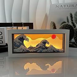 - Bring timeless Japanese art and ambient beauty into your space with this handcrafted LED shadow box lamp, inspired by Hokusai's iconic The Great Wave off Kanagawa. Each piece features a multi layered 3D paper carving, carefully assembled to create stunning depth, motion and light-shadow contrast—turning your wall or shelf into a living piece of art. Whether you're seeking a soothing night light for your bedroom, an aesthetic mood light for your workspace or a unique Japanese decor piece for your home, this lamp elevates any environment with elegance and serenity. Its soft warm white LED glow promotes relaxation, mindfulness and a cozy atmosphere. This lamp can be powered via USB or with batteries, making it convenient to enjoy its beautiful glow even in places without power outlets. Lightweight and durable, it's perfect for personal use or as a thoughtful gift for art lovers, students and fans of Japanese culture. Elevate your space. Illuminate your soul. Disclaimer: This product is an artistic reinterpretation inspired by public domain artwork.