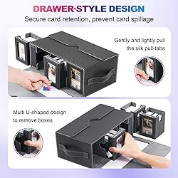 Patented Design: 7-in-1 card storage box has 6 deck box with commander display windows and 1 large dice box with removable cover; The dice box doubles as a dice tray; Perfect for competitive Gauntlet play formats (EDH or Standard) Practical and Portable: Each modular deck box features a dedicated commander slot equipped with 35PT magnetic card holder for quick identification; The outer storage case includes both a carrying handle and transparent viewing windows on both sides Ample Capacity: This deck case holds 6*100+ double-sleeved cards, 6*140+ single-sleeved cards or 6*240+ sleeveless cards(MTG/PTCG/Yugioh); Also can store 6*100 Dragon Shield double-sleeved cards; Wrap your cards, dice, tokens and counters in one box Premium Quality: Multi-magnetic security system keeps decks safely enclosed; Soft microfiber interior prevents card wear while waterproof PU exterior resists scratches which combined with the dense stitching makes the whole box a very solid structure Choose us: Whether you are MTG, PTCG or other TCG enthusiast or sports card collector, it's great for organizing your collections; This card box is unique; Design Patent is Authorized & Patent for invention is pending; Start Battle with your friends-UAONO card deck box keeps your cards organized so you can focus on battling friends