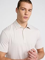 Crafted from a lightweight, breathable pique fabric, this polo offers a soft feel with added stretch, ensuring comfort throughout the day. The subtle striped pattern adds a touch of sophistication, making it suitable for both any setting. Designed with moisture-wicking fabric, this polo helps keep you dry and comfortable, whether you're at the office or golfing on the weekend Features include a classic three-button placket, short sleeves, and a straight hem, providing a timeless silhouette that pairs well with jeans, chinos, or shorts. Model is 6'2'' tall and size M, wearing a size M polo.