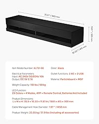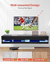 Ample Storage Space: Keep your living room neat and organized! The wall-mounted design frees up floor space and makes it easy for your robot vacuum to clean. It fits various TV sizes and has a storage cabinet for books and other essentials, plus hidden cable holes to keep things tidy. No more clutter, just a streamlined look! Convenient Power Outlets: Say goodbye to tangled wires! This TV stand comes with 2 standard outlets and 2 USB ports, ideal for powering your TV, DVD player, and Wi-Fi router. Charging your devices is now easier, and your space stays cleaner. Customizable Ambiance: Set the mood with 29 adjustable LED light modes! Whether you want a flashy gaming setup or a relaxed party vibe, you can easily control the lights with the app or remote. It’s all about creating the ideal atmosphere for any occasion and enhancing your viewing experience. Sturdy and Durable: Built with P2-grade particleboard and coated panels, this floating TV stand is water-resistant, scratch-proof, and easy to wipe down. It can hold up to 110 lbs, so it’s ideal for your TV and other devices. Durable enough to last, it’ll keep your setup looking great for years. Hassle-Free Setup: Installing your new floating entertainment shelf is a breeze! It comes with all the hardware you need, and the quiet hinge doors won’t make a sound. With easy-to-follow instructions, you’ll have it set up in no time—no missing parts, no complicated steps.