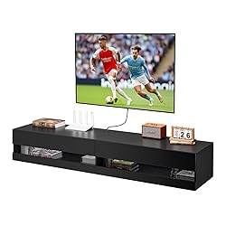 - This floating TV stand provides spacious storage with built-in power outlets for charging multiple devices. With 29 adjustable LED light modes, it creates a personalized ambiance. Built to last, it supports up to 110 lbs. Easy to install, it’s a simple way to upgrade your living room with style and convenience.