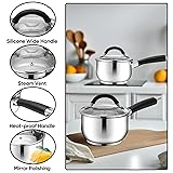 HEALTHY & PREMIUM STAINLESS STEEL: Made of food-grade high-quality stainless steel for long-lasting performance and durability, Saucepan without coating to ensure that non-toxic substances do not fall into your food, Healthy and durable for your daily cooking use HEAT QUICKLY & EVENLY: Tri-ply construction base consists of stainless steel interior aluminum core and stainless steel exterior, Providing fast and even heat conductivity for exceptional cooking results, Compatible with all cooktops like gas, electric, glass, ceramic, halogen, etc WELL MADE & EASY CLEAN: Smooth edges and mirror polish make stains difficult to stay, Dishwasher safe makes cleaning easy and saves time, Hand washing is recommended to extend usage time, Hanging holes on the handle for easy hanging and storage to keep your kitchen clean and tidy EASY TO GRIP & VISIBLE COOKING: Hollow heat-resistant silicone handle reduces heat transfer keeps cool to the touch, Wide handles are suitable for easy grips of hands of different sizes, providing safe and comfortable grips during cooking, Transparent glass lid can check the cooking status of food without opening the lid, better locking in the moisture and nutrition of food MULTI-PURPOSE SAUCEPAN: 2QT saucepan is suitable for small family or 2-3 people service, Its ideal size and durable construction make it a great choice for daily cooking, like boiling eggs, cereals, hot milk, melted butter, sugar, or making sauces, soups, macaroni and cheese, and more