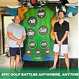 VERSATILE FAMILY ENTERTAINMENT - Transform any space into a fun activity zone with this complete set that works perfectly in backyards during summer and indoors during winter or when weather changes, providing year-round engagement for all family members and friends alike INNOVATIVE STICKY TECHNOLOGY - Features specially designed sticky balls and targets that allow you to score and track points easily, making it safe for indoor play and exciting for outdoor adventures. SKILL-BUILDING FOR ALL AGES - Carefully designed to challenge adults allowing them to practice their swing , while remaining accessible for children under supervision , this chipping set helps develop hand-eye coordination and precision in a fun, pressure-free environment that builds confidence and a love of golf PREMIUM PORTABLE DESIGN - Lightweight construction allows easy transport between locations. A free carrying case is provided to take wherever you go. It can quickly be setup in living rooms, basements, patios, or yards without tools or complicated assembly COMPLETE STARTER SET - Includes everything needed for immediate play with a large mat full of targets , 5 game modes, sticky balls, hanging equipment, a travel case, and clear instructions. It accomodates 1-4 players simultaneously for group entertainment and family bonding activities. The product is intended for you to use your own club.