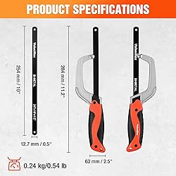 Lightweight & Compact: This mini hack saw features an aluminum alloy frame, weighing only approximately 245g for easy handling. With a compact dimension of 11 x 2.3 x 0.8 in, it is suitable for operation in confined spaces 2PC 10inch hacksaw blade: A blade has been pre-installed, and an additional one is provided as a spare. The hacksaw blades are made of bi-metal, with specifications of 10" x 1/2"x 24T.With fine teeth, they excel at cutting hard materials like metal Ergonomic Anti-Slip Handle: The handle consists of ABS & TPR. It is elastic, soft to the touch, and offers excellent anti-slip performance. Designed with ergonomic principles, it ensures comfort even during prolonged use Easy Blade Change & Length Adjust: Simply use a screwdriver to loosen the upper screw, and the hacksaw blade can be replaced effortlessly. Its design allows blade length adjustment and replacement, ensuring long-term use Versatile for Multiple Materials: This small hacksaw is effective for use in small areas and craft projects, ideal for cutting wood, plastic (PVC), metal(stainless steel), foam, and more.It also makes an ideal gift for friends and family