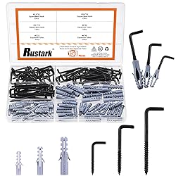 - ★Rustark Black Spiral in Square Bend Hook Kit with Expansion Tubes L Shaped Screw in Hooks Square Bend Screw Hook for Hanging Workplace Home Office ★ WHY CHOOSE US? ❤You'll receive a 150pcs 3 sizes black square bend hook kit with expansion tubes. Sufficient quantity and rich sizes to meet your different needs in daily life. ❤These l shaped screws hooks are made of carbon steel with black finish which are not easy break, wear-resistant, corrosion-resistant, and durable with long-term service life. ❤Suitable for hanging light weight items firmly, such as lamps, curtains, ropes, chains, cups, feeders, flower pots, dish towels, pictures, paintings, coats, hats, plants, keys, etc. ❤The square bend screw hooks in various sizes are packed neatly in a separate compartment in a transparent storage box, making it easy to get the right size you need. ★Specifications: ✯Product Type: Square Bend Hook Kit ✯Quantity: 150Pcs ✯Material: Carbon Steel with Black Finish ✯Color: Black ✯Size: M2.8x35mm, M3.7x70mm, M3.8x50mm; Please see the 2nd picture for more size information. ★What You Get: 15pcs------#8x40 expansion tubes 35pcs------#5x25 expansion tubes 25pcs------#6x30 expansion tubes 35pcs------M2.8x35mm square bend hooks 15pcs------M3.7x70mm square bend hooks 25pcs------M3.8x50mm square bend hooks Total: 150pcs ❤Warm Tips: -If you come across any questions or problems, please feel free to come to us. We will solve it for you as soon as possible!