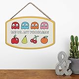 - Bandai Namco licensed product: Give your walls a retro upgrade with the Pac-Man Solves My Problems hanging wood sign. Featuring the classic arcade hero and his ghostly adversaries, this sign adds nostalgia and humor to your space. The distressed wooden texture and bold print make it stand out in any game room or office. Perfect for fans of vintage video games and quirky wall art.