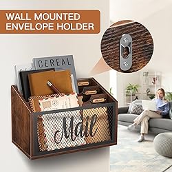 Vintage Desktop Mail Organizer - BOTOP mail organizer creatively blends a solid wood panel with a iron mesh design, breaking the monotony of traditional mailboxes. The panel features a bold "MAIL" label, adding a rustic industrial charm to any desk. Multi-Scenario Flexibility - Designed to stand sturdily on desktop or mount on the wall, this mail holder neatly sorts bills, letters, documents, notebooks, and advertisements. Perfect for home offices, workspaces, entryways, or as a decorative desk accent. Removable Tiered Dividers - Three layers of dividers can be easily removed for cleaning or to customize storage space size. Comes with divider label design, which can be personalized by name, department, category, or theme. Effortless Assembly - Includes step-by-step illustrated instructions, screws, and tools for quick setup. Its sturdy construction and non-slip base ensure lasting durability. Ideal Compact Size - Optimized for desk organization (11.4" L × 6.1" W × 7.28" H), this indoor mail tray securely holds envelopes, bills, and even doubles as a magazine holder to maintain a clean, clutter-free aesthetic.
