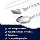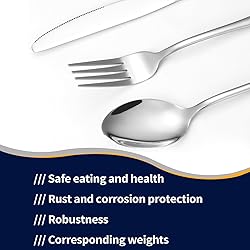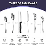 【48 Piece Silverware Set】Service for 8 - This silver ware set contains: 8 steak knives, 8 dinner knives, 8 dinner forks, 8salad forks, 8 dinner spoons and 8 teaspoons.Perfect stainless steel silverware for home, restaurant, family daily use, entertaining, wedding, outdoor dining, camping, dinner party, holiday usage and festival gathering. The silverware set is shiny. 【High Quality Material Flatware Set】This flatware set are made of food grade stainless steel which is sturdiness ensures , not bend easily , rust-proof, corrosion resistant, non-toxic, BPA free, no metal aftertaste providing you with long - term use. Best of all, they're dishwasher safe. 【Sleek Modern Design & Original Sets 】Each stainless steel flatware set and is original designed, which is perfectly matche for every piece. both have comfortable weight and has a certain thickness. Give your table setting more flavor. 【Suitable for all occasions】 This shiny flatware set is perfect for Thanksgiving Day, Mother's Day, Housewarming, Wedding, Restaurant, Hotel or Daily Use. 【Care Instructions】: Dishwasher-safe for your convenience. Avoid using steel wool, hard sponges, or abrasive cleaning tools that may scratch the surface to preserve the mirror finish.