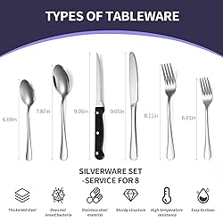 - Service for 8 - This silver ware set contains: 8 steak knives, 8 dinner knives, 8 dinner forks, 8salad forks, 8 dinner spoons and 8 teaspoons.Perfect black stainless steel silverware for home, restaurant, family daily use, entertaining, wedding, outdoor dining, camping, dinner party, holiday usage and festival gathering. The silverware set black color is dark and shiny. This flatware set are made of food grade stainless steel which is sturdiness ensures , not bend easily , rust-proof, corrosion resistant, non-toxic, BPA free, no metal aftertaste providing you with long - term use. Best of all, they're dishwasher safe. This shiny black flatware set is perfect for Thanksgiving Day, Mother's Day, Housewarming, Wedding, Restaurant, Hotel or Daily Use. Each stainless steel flatware set and is original designed, which is perfectly matche for every piece. both have comfortable weight and has a certain thickness. Give your table setting more flavor. Dishwasher-safe for your convenience. Avoid using steel wool, hard sponges, or abrasive cleaning tools that may scratch the surface to preserve the mirror finish.