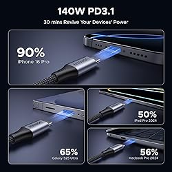 140W Max fast charging: This fast charging cord can charge a MacBook Pro 2024 from 0% to 56% in 30 minutes using single port 2-in-1 Charging Cable: This 2 in 1 cable can charge both your smartphone and computer simultaneously, making it perfect for travel and business trips. Designed to minimize clutter, it keeps your space organized and reduces the burden on your travels Intelligent power distribution: Enhance your charging efficiency with this versatile cable, built-in 2 chips to distribute power intelligently and shorten charging time Durable and Long Lasting: With tough nylon braided material and Aluminum alloy shell, this 140W USB C cable can achieve over 10,000+ bend tests, providing a reliable feeling of use. Tangle-free design makes it easy to pack and store Fast Data Transfer: This type c data cable transfers data at up to 480Mbps to quickly transfer 1GB movies, music, documents or entire photo libraries in less than a minute. (Note: Do not support video output)