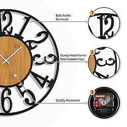【Easy-to-Read Large Numbers】 Extra large 30" face with bold Arabic numerals makes wall clock effortlessly readable for people learning time, busy adults glancing across the room, and seniors needing clear visibility - no squinting required 【Stylish Home & Office Decor】 This decorative wall clock features a sturdy metal frame paired with a warm wooden face, perfectly blending industrial flair with farmhouse charm. Its design effortlessly complements modern, vintage, rustic, or minimalist interiors, making it a versatile accent for any room. 【Battery Powered & Secure Wall Mounting】Despite its impressive 30 inch size, this wall clock is easy to install—simply hang it using the included heavy-duty hook for a secure and stable display. Powered by 1 AA battery (not included). 【Quiet Tick with Quality Movement】This oversized wall clock runs on a high-quality step movement that's nearly silent—just a soft, steady tick that's calming to have in the background. No loud ticking sounds, just quiet time you can count on 【Perfect Housewarming Gift】This stylish yet functional extra large wall clock works anywhere - bedroom, living room, kitchen, bathroom, or office. More thoughtful than regular gifts, it's ideal for Christmas, birthdays & anniversaries too