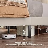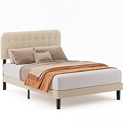 Adjustable Headboard: Measuring 80.7" L x 61.8" W x 50.4" H, this queen-size bed frame offers exceptional comfort and style. The upholstered queen bed frame features two different height adjustable linen headboards designed for 8-12" mattresses. High-density sponge padding ensures lasting comfort for reading or TV time Sturdy and Noiseless: The queen bed frame with headboard consists of 12 solid wood slats and a sturdy metal frame. 8 support points can support up to 850 pounds of weight. Designed with EVA foam and velcro, this queen-size platform bed frame prevents movement and reduces noise. It effectively eliminates squeaking caused by friction between wood and metal components, ensuring undisturbed sleep quality Smart Storage Space: This queen bed frame for small spaces offers 8.5 inches of clearance underneath, creating valuable storage room for luggage, shoeboxes, and storage boxes, and the sweeping robot can easily pass through to keep the bedroom clean and tidy. Providing a perfect space-saving solution for small bedrooms Choose Your Perfect Fit: This premium platform bed frame is available in three versatile sizes ( Full, Queen and King) to suit any bedroom space. Each size offers two stylish color options (Grey and Beige). Its modern minimalist design matches your existing decor seamlessly Quick Assembly: Designed for quick setup, this easy assembly bed frame queen size comes with all parts and tools packed in one box, featuring numbered pieces for your convenience. Simply follow the step-by-step instructions to quickly assemble your new bed frame with headboard