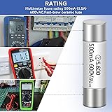 Rating:Multimeter fuses rating 500mA (0.5A) 600VAC Fast-blow ceramic fuse Size:The size of these 500ma 600v ceramic fuses is 5 x 20 mm (0.79 x 0.2 inches), replacement for digital multimeter fuse hv510 500ma 600v 5x20mm Function:hv510 fuse 500ma 600vac ceramic fast fuses is use in short circuit and overload protection of multimeters to protect the safe operation of circuits Material:Our HV510 0.5A 600vac 20 mm fuse are made of high-strength ceramic body, and nickel-plated metal end caps, Compared to traditional glass fuses,ceramic body offer better insulation, heat resistance and flame retardancy Note: Please turn off the power before replacement. Please check the dimensions of the old fuse before purchase, body diameter, body length, rated current, rated voltage