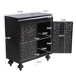 - Enhance your home decor with this stylish and functional accent cabinet. The embossed pattern and distressed finish add a touch of vintage charm to any space. With durable construction and ample storage, this cabinet is perfect for organizing household items while maintaining a clean and tidy space. Design & Aesthetic Appeal. This accent cabinet blends rustic elegance with timeless charm, featuring intricate carvings, distressed finishes, and vintage designs. It adds a unique decorative touch. The overall black color with golden accents can seamlessly integrate into various interior styles, from farmhouse to modern chic. Durable Construction & Sturdy SupportCrafted from Steel, this cabinet promise lasting strength and durability. The construction is designed for stability, with features like anti-tipping designs, sturdy shelves that can hold up to 75 lbs, and metal door handles. Plastic adjustable feet prevent floor damage, ensuring that the cabinet remains firmly in place, even on uneven surfaces. Functional Storage SolutionsWith ample storage space, this cabinet is ideal for organizing household essentials. It typically feature shelves, spacious interior compartments, and a large tabletop for decorative displays. Whether for use in the living room, hallway, entryway, or dining room, the cabinet offers practical solutions for storing everything from books to kitchenware, while maintaining a clean and tidy space Ease of Assembly & VersatilityIt is easy to assemble, with clear, step-by-step instructions and labeled parts. Versatile in use, this cabinet serves various purposes—from storage to display—perfectly fitting into spaces like the living room, hallway, or as a coffee bar. The combination of aesthetic appeal and practical design makes them a valuable addition to any home.